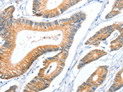 The image on the left is immunohistochemistry of paraffin-embedded Human colon cancer tissue using CSB-PA587551(ACY3 Antibody) at dilution 1/35, on the right is treated with fusion protein. (Original magnification: ×200)