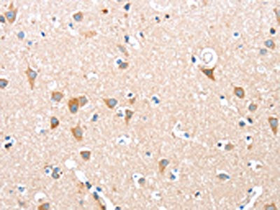 The image on the left is immunohistochemistry of paraffin-embedded Human brain tissue using CSB-PA932466(ADAM15 Antibody) at dilution 1/35, on the right is treated with fusion protein. (Original magnification: ×200)
