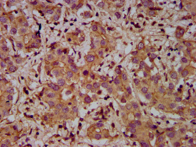 IHC image of CSB-PA001285LA01HU diluted at 1:400 and staining in paraffin-embedded human liver cancer performed on a Leica BondTM system. After dewaxing and hydration, antigen retrieval was mediated by high pressure in a citrate buffer (pH 6.0). Section was blocked with 10% normal goat serum 30min at RT. Then primary antibody (1% BSA) was incubated at 4°C overnight. The primary is detected by a biotinylated secondary antibody and visualized using an HRP conjugated SP system.