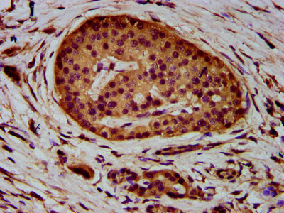 IHC image of CSB-PA001285LA01HU diluted at 1:400 and staining in paraffin-embedded human pancreatic cancer performed on a Leica BondTM system. After dewaxing and hydration, antigen retrieval was mediated by high pressure in a citrate buffer (pH 6.0). Section was blocked with 10% normal goat serum 30min at RT. Then primary antibody (1% BSA) was incubated at 4°C overnight. The primary is detected by a biotinylated secondary antibody and visualized using an HRP conjugated SP system.
