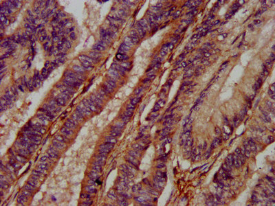 IHC image of CSB-PA837445LA01HU diluted at 1:400 and staining in paraffin-embedded human colon cancer performed on a Leica BondTM system. After dewaxing and hydration, antigen retrieval was mediated by high pressure in a citrate buffer (pH 6.0). Section was blocked with 10% normal goat serum 30min at RT. Then primary antibody (1% BSA) was incubated at 4°C overnight. The primary is detected by a biotinylated secondary antibody and visualized using an HRP conjugated SP system.