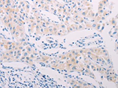 The image on the left is immunohistochemistry of paraffin-embedded Human lung cancer tissue using CSB-PA485300(ADAMTS17 Antibody) at dilution 1/60, on the right is treated with synthetic peptide. (Original magnification: ×200)