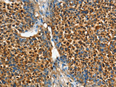 The image on the left is immunohistochemistry of paraffin-embedded Human thyroid cancer tissue using CSB-PA249707(ADCY4 Antibody) at dilution 1/45, on the right is treated with fusion protein. (Original magnification: ×200)