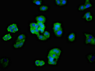 Immunofluorescent analysis of HepG2 cells using CSB-PA523985LA01HU at dilution of 1:100 and Alexa Fluor 488-congugated AffiniPure Goat Anti-Rabbit IgG(H+L)