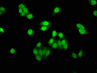 Immunofluorescence staining of HepG2 cells with CSB-PA819883LA01HU at 1:530, counter-stained with DAPI. The cells were fixed in 4% formaldehyde, permeabilized using 0.2% Triton X-100 and blocked in 10% normal Goat Serum. The cells were then incubated with the antibody overnight at 4°C. The secondary antibody was Alexa Fluor 488-congugated AffiniPure Goat Anti-Rabbit IgG(H+L).