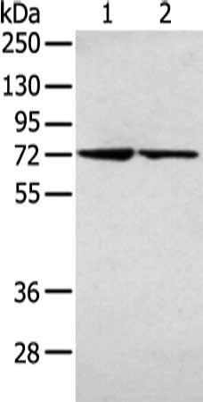 Gel: 8%SDS-PAGE, Lysate: 40 μg, Lane 1-2: 231 and 293T cell, Primary antibody: CSB-PA043528(AGPS Antibody) at dilution 1/200 dilution, Secondary antibody: Goat anti rabbit IgG at 1/8000 dilution, Exposure time: 5 seconds