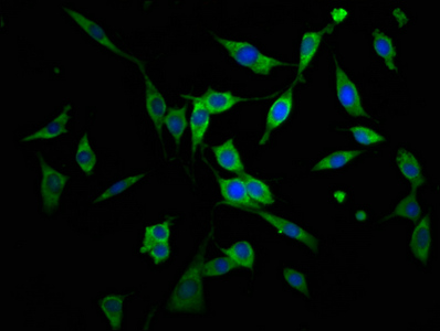 Immunofluorescence staining of NIH/3T3 cells with CSB-PA001457LA01HU at 1:166, counter-stained with DAPI. The cells were fixed in 4% formaldehyde, permeabilized using 0.2% Triton X-100 and blocked in 10% normal Goat Serum. The cells were then incubated with the antibody overnight at 4°C. The secondary antibody was Alexa Fluor 488-congugated AffiniPure Goat Anti-Rabbit IgG(H+L).