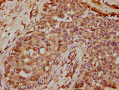 IHC image of CSB-PA13057A0Rb diluted at 1:400 and staining in paraffin-embedded human breast cancer performed on a Leica BondTM system. After dewaxing and hydration, antigen retrieval was mediated by high pressure in a citrate buffer (pH 6.0). Section was blocked with 10% normal goat serum 30min at RT. Then primary antibody (1% BSA) was incubated at 4°C overnight. The primary is detected by a biotinylated secondary antibody and visualized using an HRP conjugated SP system.