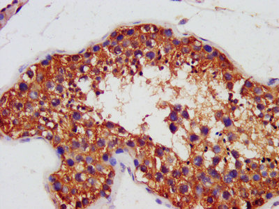 IHC image of CSB-PA001492HA01HU diluted at 1:1400 and staining in paraffin-embedded human testis tissue performed on a Leica BondTM system. After dewaxing and hydration, antigen retrieval was mediated by high pressure in a citrate buffer (pH 6.0). Section was blocked with 10% normal goat serum 30min at RT. Then primary antibody (1% BSA) was incubated at 4°C overnight. The primary is detected by a biotinylated secondary antibody and visualized using an HRP conjugated SP system.