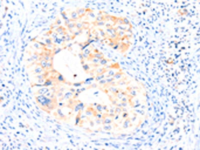 The image on the left is immunohistochemistry of paraffin-embedded Human liver cancer tissue using CSB-PA904906(AIMP2 Antibody) at dilution 1/25, on the right is treated with synthetic peptide. (Original magnification: ×200)