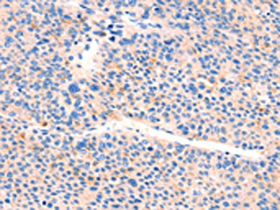 The image on the left is immunohistochemistry of paraffin-embedded Human cervical cancer tissue using CSB-PA904906(AIMP2 Antibody) at dilution 1/25, on the right is treated with synthetic peptide. (Original magnification: ×200)