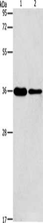 Gel: 12%SDS-PAGE, Lysate: 40 μg, Lane 1-2: A549 cells, NIH/3T3 cells, Primary antibody: CSB-PA904906(AIMP2 Antibody) at dilution 1/200, Secondary antibody: Goat anti rabbit IgG at 1/8000 dilution, Exposure time: 10 seconds