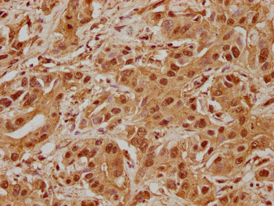 IHC image of CSB-PA836229NA01HU diluted at 1:100 and staining in paraffin-embedded human liver cancer performed on a Leica BondTM system. After dewaxing and hydration, antigen retrieval was mediated by high pressure in a citrate buffer (pH 6.0). Section was blocked with 10% normal goat serum 30min at RT. Then primary antibody (1% BSA) was incubated at 4°C overnight. The primary is detected by a biotinylated secondary antibody and visualized using an HRP conjugated SP system.