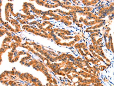 The image on the left is immunohistochemistry of paraffin-embedded Human thyroid cancer tissue using CSB-PA219365(AK5 Antibody) at dilution 1/60, on the right is treated with synthetic peptide. (Original magnification: ×200)