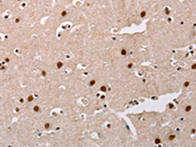 The image on the left is immunohistochemistry of paraffin-embedded Human brain tissue using CSB-PA547116(AKAP8L Antibody) at dilution 1/20, on the right is treated with fusion protein. (Original magnification: ×200)