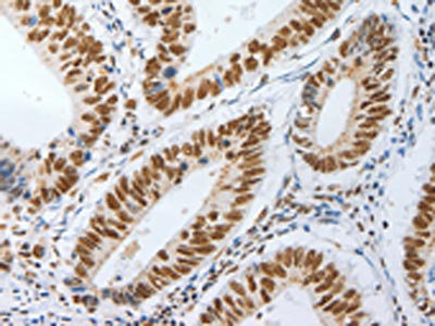 The image on the left is immunohistochemistry of paraffin-embedded Human colon cancer tissue using CSB-PA611485(AKAP8L Antibody) at dilution 1/25, on the right is treated with synthetic peptide. (Original magnification: ×200)