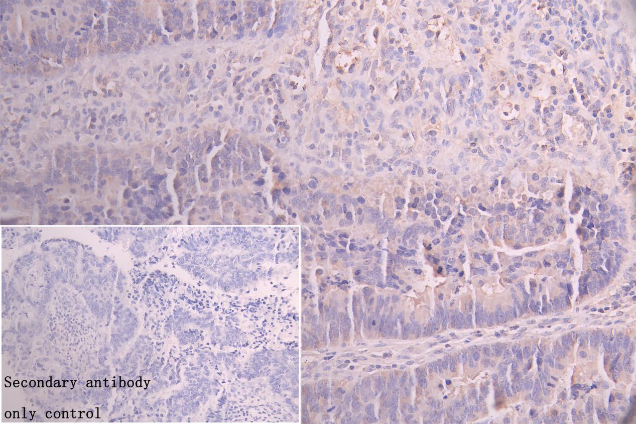 IHC image of CSB-PA857882LA01HU diluted at 1:250 and staining in paraffin-embedded human colorectal cancer performed on a Leica BondTM system. After dewaxing and hydration, antigen retrieval was mediated by high pressure in a citrate buffer (pH 6.0). Section was blocked with 10% normal goat serum 30min at RT. Then primary antibody (1% BSA) was incubated at 4°C overnight. The primary is detected by a Goat anti-rabbit polymer IgG labeled by HRP and visualized using 0.05% DAB. Secondary antibody only control: uses 1% BSA instead of primary antibody