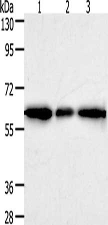 Gel: 10%SDS-PAGE, Lysate: 27 μg, Lane 1-3: Human liver cancer tissue, hela cells, 293T cells, Primary antibody: CSB-PA082936(AKR1A1 Antibody) at dilution 1/500, Secondary antibody: Goat anti rabbit IgG at 1/8000 dilution, Exposure time: 10 seconds