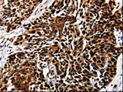 The image is immunohistochemistry of paraffin-embedded Human esophagus cancer tissue using CSB-PA098004(AKT1 Antibody) at dilution 1/25. (Original magnification: ×200)