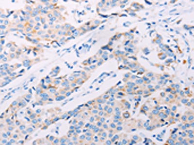 The image on the left is immunohistochemistry of paraffin-embedded Human breast cancer tissue using CSB-PA090961(AKT2 Antibody) at dilution 1/70, on the right is treated with synthetic peptide. (Original magnification: ×200)
