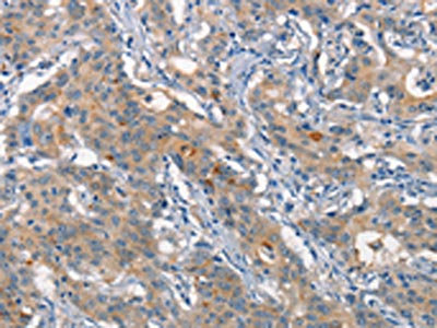 The image on the left is immunohistochemistry of paraffin-embedded Human gastric cancer tissue using CSB-PA104246(ALCAM Antibody) at dilution 1/15, on the right is treated with synthetic peptide. (Original magnification: ×200)