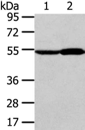 Gel: 6%SDS-PAGE, Lysate: 40 μg, Lane 1-2: Human fetal liver and normal liver tissue, Primary antibody: CSB-PA033785(ALDH3A2 Antibody) at dilution 1/250 dilution, Secondary antibody: Goat anti rabbit IgG at 1/8000 dilution, Exposure time: 10 seconds