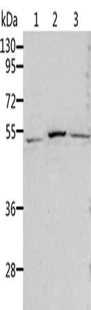 Gel: 10%SDS-PAGE, Lysate: 40 μg, Lane 1-3: Human normal kidney tissue, Human liver tissue, human liver cancer tissue, Primary antibody: CSB-PA272345(ALDH3B1 Antibody) at dilution 1/200, Secondary antibody: Goat anti rabbit IgG at 1/8000 dilution, Exposure time: 45 seconds
