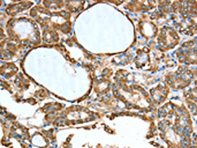 The image on the left is immunohistochemistry of paraffin-embedded Human thyroid cancer tissue using CSB-PA284873(ALDH9A1 Antibody) at dilution 1/50, on the right is treated with synthetic peptide. (Original magnification: ×200)