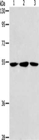 Gel: 8%SDS-PAGE, Lysate: 40 μg, Lane 1-3: Human fetal liver tissue, hela cells, Human fetal brain tissue, Primary antibody: CSB-PA284873(ALDH9A1 Antibody) at dilution 1/240, Secondary antibody: Goat anti rabbit IgG at 1/8000 dilution, Exposure time: 30 seconds