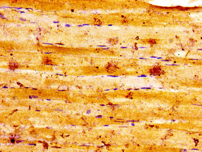 IHC image of CSB-PA00015A0Rb diluted at 1:100 and staining in paraffin-embedded human skeletal muscle tissue performed on a Leica BondTM system. After dewaxing and hydration, antigen retrieval was mediated by high pressure in a citrate buffer (pH 6.0). Section was blocked with 10% normal goat serum 30min at RT. Then primary antibody (1% BSA) was incubated at 4°C overnight. The primary is detected by a biotinylated secondary antibody and visualized using an HRP conjugated SP system.