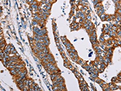 The image on the left is immunohistochemistry of paraffin-embedded Human gastic cancer tissue using CSB-PA314311(ALG2 Antibody) at dilution 1/35, on the right is treated with fusion protein. (Original magnification: ×200)