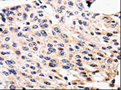 The image is immunohistochemistry of paraffin-embedded Human cervical cancer tissue using CSB-PA847171(ALK Antibody) at dilution 1/25. (Original magnification: ×200)