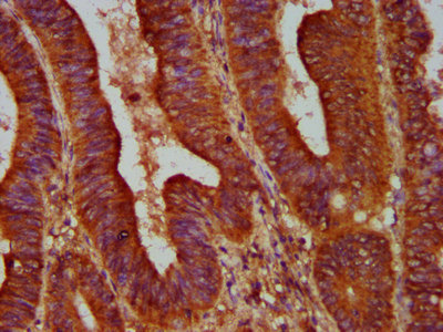 IHC image of CSB-PA001617LA01HU diluted at 1:500 and staining in paraffin-embedded human colon cancer performed on a Leica BondTM system. After dewaxing and hydration, antigen retrieval was mediated by high pressure in a citrate buffer (pH 6.0). Section was blocked with 10% normal goat serum 30min at RT. Then primary antibody (1% BSA) was incubated at 4°C overnight. The primary is detected by a biotinylated secondary antibody and visualized using an HRP conjugated SP system.