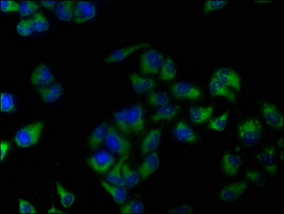 Immunofluorescence staining of Hela cells with CSB-PA001621LA01HU at 1:133, counter-stained with DAPI. The cells were fixed in 4% formaldehyde, permeabilized using 0.2% Triton X-100 and blocked in 10% normal Goat Serum. The cells were then incubated with the antibody overnight at 4°C. The secondary antibody was Alexa Fluor 488-congugated AffiniPure Goat Anti-Rabbit IgG(H+L).