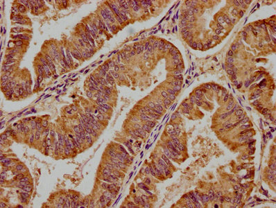 IHC image of CSB-PA001621LA01HU diluted at 1:400 and staining in paraffin-embedded human endometrial cancer performed on a Leica BondTM system. After dewaxing and hydration, antigen retrieval was mediated by high pressure in a citrate buffer (pH 6.0). Section was blocked with 10% normal goat serum 30min at RT. Then primary antibody (1% BSA) was incubated at 4°C overnight. The primary is detected by a biotinylated secondary antibody and visualized using an HRP conjugated SP system.