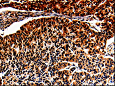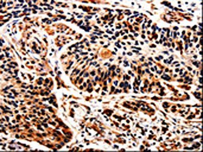 The image is immunohistochemistry of paraffin-embedded Human lung cancer tissue using CSB-PA787659(ALOX5 Antibody) at dilution 1/25. (Original magnification: ×200)
