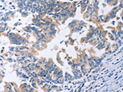 The image on the left is immunohistochemistry of paraffin-embedded Human gastric cancer tissue using CSB-PA248410(AMACR Antibody) at dilution 1/30, on the right is treated with fusion protein. (Original magnification: ×200)