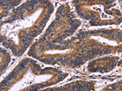 The image on the left is immunohistochemistry of paraffin-embedded Human colon cancer tissue using CSB-PA176639(AMIGO2 Antibody) at dilution 1/50, on the right is treated with fusion protein. (Original magnification: ×200)