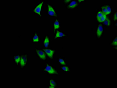 Immunofluorescence staining of Hela cells with CSB-PA880128LA01HU at 1:200, counter-stained with DAPI. The cells were fixed in 4% formaldehyde, permeabilized using 0.2% Triton X-100 and blocked in 10% normal Goat Serum. The cells were then incubated with the antibody overnight at 4°C. The secondary antibody was Alexa Fluor 488-congugated AffiniPure Goat Anti-Rabbit IgG(H+L).