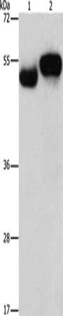 Gel: 8%SDS-PAGE, Lysate: 40 μg, Lane 1-2: Human fetal brain tissue, Human liver tissue, Primary antibody: CSB-PA292485(AMZ1 Antibody) at dilution 1/1000, Secondary antibody: Goat anti rabbit IgG at 1/8000 dilution, Exposure time: 3 minutes