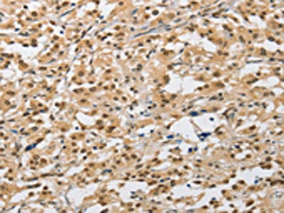 The image on the left is immunohistochemistry of paraffin-embedded Human thyroid cancer tissue using CSB-PA063322(AMZ2 Antibody) at dilution 1/40, on the right is treated with fusion protein. (Original magnification: ×200)
