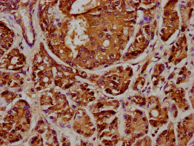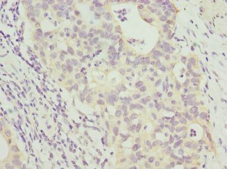 IHC image of CSB-PA892446DSR1HU diluted at 1:348 and staining in paraffin-embedded human pancreatic cancer performed on a Leica BondTM system. After dewaxing and hydration, antigen retrieval was mediated by high pressure in a citrate buffer (pH 6.0). Section was blocked with 10% normal goat serum 30min at RT. Then primary antibody (1% BSA) was incubated at 4°C overnight. The primary is detected by a biotinylated secondary antibody and visualized using an HRP conjugated SP system.