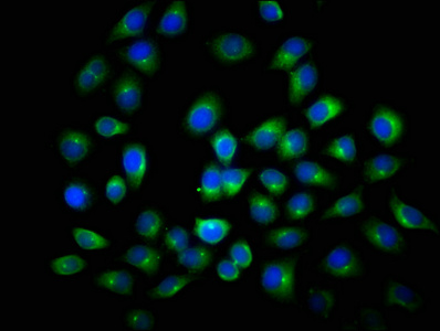 Immunofluorescence staining of A549 cells with CSB-PA892446DSR1HU at 1:116, counter-stained with DAPI. The cells were fixed in 4% formaldehyde, permeabilized using 0.2% Triton X-100 and blocked in 10% normal Goat Serum. The cells were then incubated with the antibody overnight at 4°C. The secondary antibody was Alexa Fluor 488-congugated AffiniPure Goat Anti-Rabbit IgG(H+L).