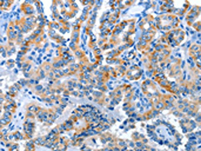 The image on the left is immunohistochemistry of paraffin-embedded Human thyroid cancer tissue using CSB-PA986263(ANKMY1 Antibody) at dilution 1/30, on the right is treated with fusion protein. (Original magnification: ×200)
