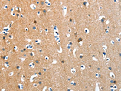 The image on the left is immunohistochemistry of paraffin-embedded Human brain tissue using CSB-PA986263(ANKMY1 Antibody) at dilution 1/30, on the right is treated with fusion protein. (Original magnification: ×200)