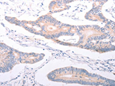 The image on the left is immunohistochemistry of paraffin-embedded Human colon cancer tissue using CSB-PA246386(ANKRA2 Antibody) at dilution 1/25, on the right is treated with synthetic peptide. (Original magnification: ×200)