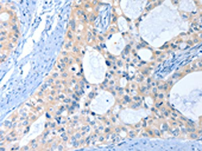 The image on the left is immunohistochemistry of paraffin-embedded Human thyroid cancer tissue using CSB-PA223011(ANKRD54 Antibody) at dilution 1/40, on the right is treated with fusion protein. (Original magnification: ×200)