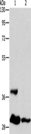 Gel: 10%SDS-PAGE, Lysate: 40 μg, Lane 1-2: Mouse testis tissue, human colon cancer tissue, Primary antibody: CSB-PA632657(ANKRD54 Antibody) at dilution 1/250, Secondary antibody: Goat anti rabbit IgG at 1/8000 dilution, Exposure time: 10 seconds