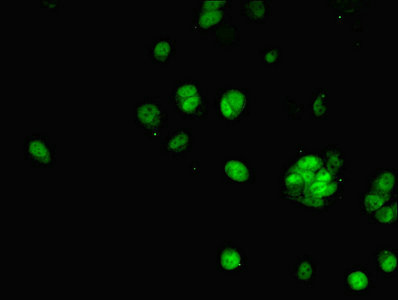 Immunofluorescent analysis of MCF-7 cells using CSB-PA001822ESR2HU at dilution of 1:100 and Alexa Fluor 488-congugated AffiniPure Goat Anti-Rabbit IgG(H+L)