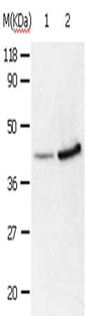 Gel: 8%SDS-PAGE, Lysate: 30 μg, Lane 1-2: 293T cells, HepG2 cells, Primary antibody: CSB-PA980450(ANXA2 Antibody) at dilution 1/540, Secondary antibody: Goat anti rabbit IgG at 1/8000 dilution, Exposure time: 30 seconds